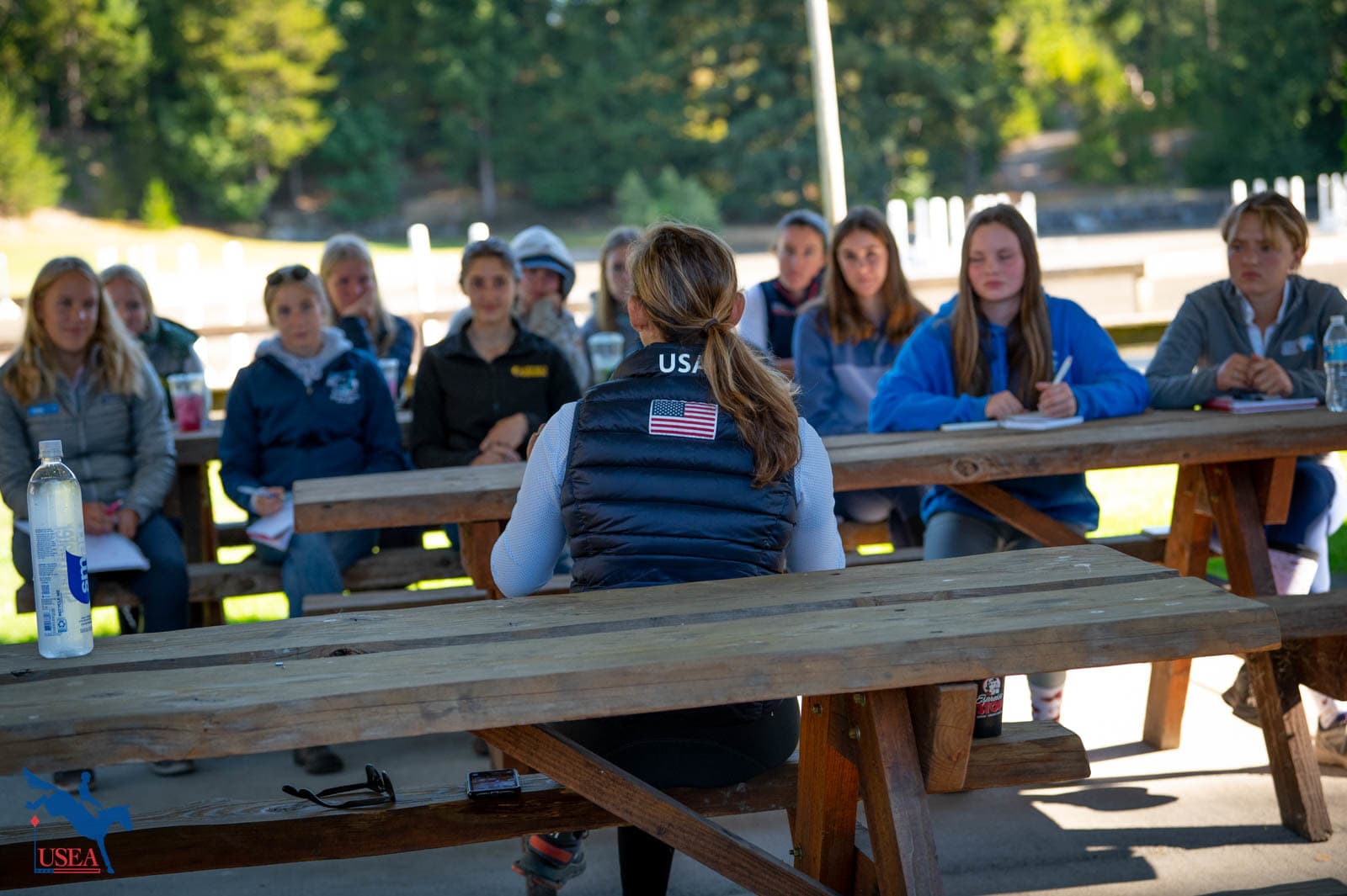 Twelve of the West Coast’s top young athletes descended upon the beautiful Aspen Farms in Yelm, Washington for the first of two USEA Emerging Athlete (EA21) Regional Clinics to be held on the west coast. As the sun rose over the pines and with misty Mt. Rainier in the background, USEA Instructor's Certification Program (ICP) Level III Certified Instructor and co-founder of the EA21 clinic series, Rebecca Brown, sat down with the eager young riders for the opening discussion that kicked off the two-day clinic.