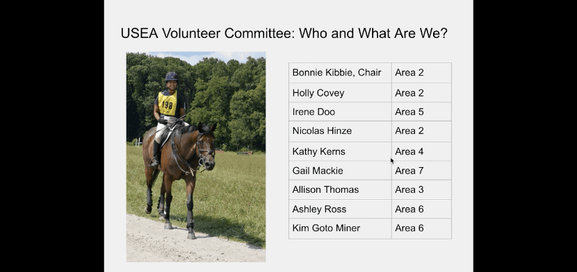 At the 2021 USEA Annual Meeting & Convention, the USEA Volunteer Committee provided updates on their work from 2021, including EventingVolunteers.com progress updates and usage statistics, volunteer educational video projects, volunteer rewards programs, and organizer practices/care of volunteers to participants in the VIP Open Forum session. Watch the presentation provided by Bonnie Kibbie, current chair of the VIP committee, during the session at Convention.
