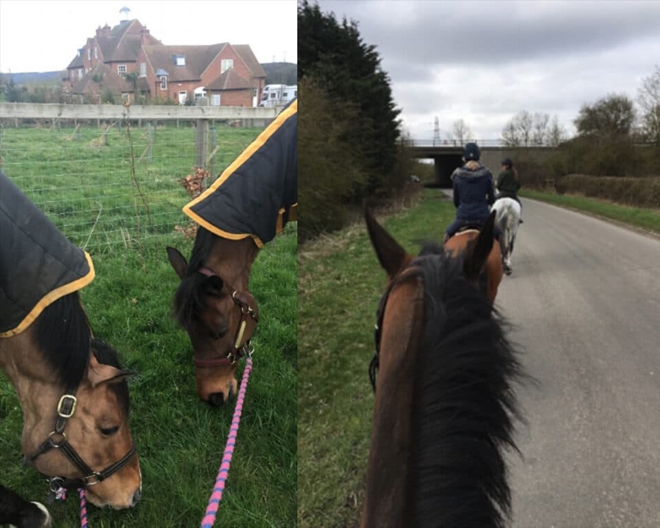 I also let Ari get a feel of the natural footing when the weather permitted because I think it’s important to practice on the surface you will perform on, and I didn’t want her getting too used to the beautiful and perfect footing all the time. Another way they prepare their horses here is road work. It seemed a bit odd at first to take horses out and walk and trot on the local roads and through little villages, but I quickly got used to it. I don’t get off the property much, so I love hacking through the local villages and down lanes between fields of sheep and cute little houses and cottages.