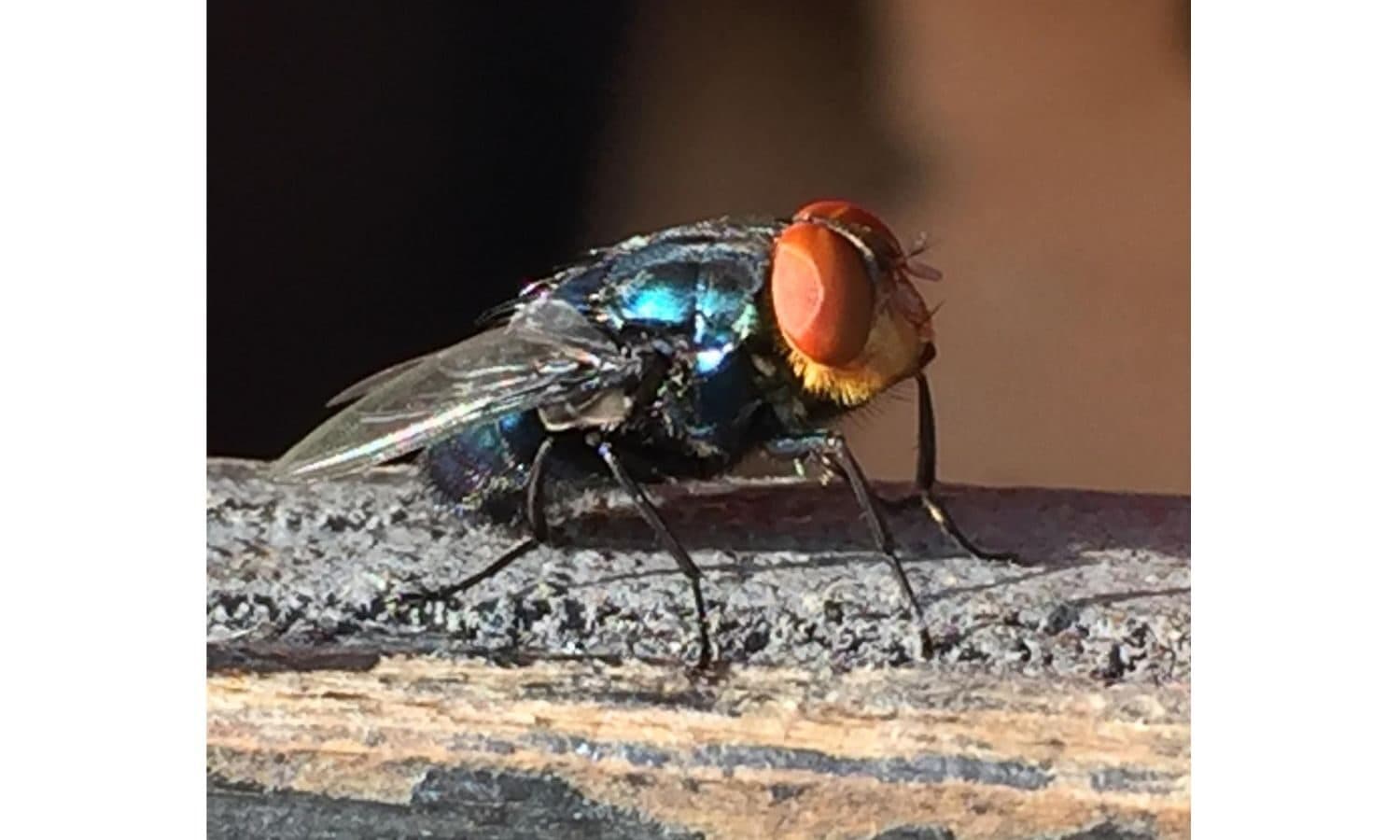 The adult fly is slightly larger than common housefly with orange eyes, metallic blue or green body with three dark stripes along its back.