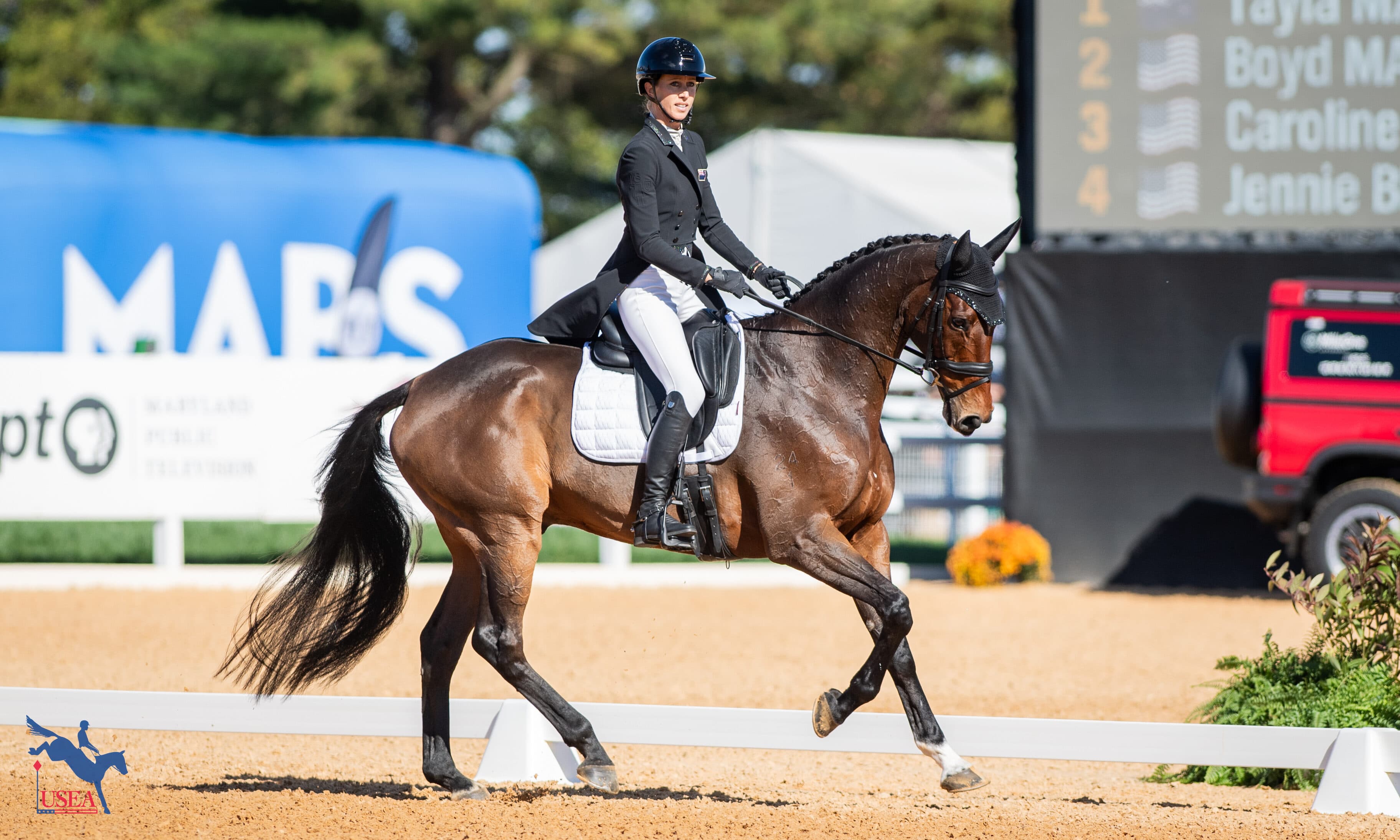 Elkton, Md.—Oct. 17— There’s a whole new crew leading the five-star at the MARS Maryland 5 Star at Fair Hill presented by Brown Advisory at the conclusion of the second day of dressage, and New Zealand’s Monica Spencer and her Thoroughbred gelding Artist are leading the field with a five-point lead on a score of 23.7.