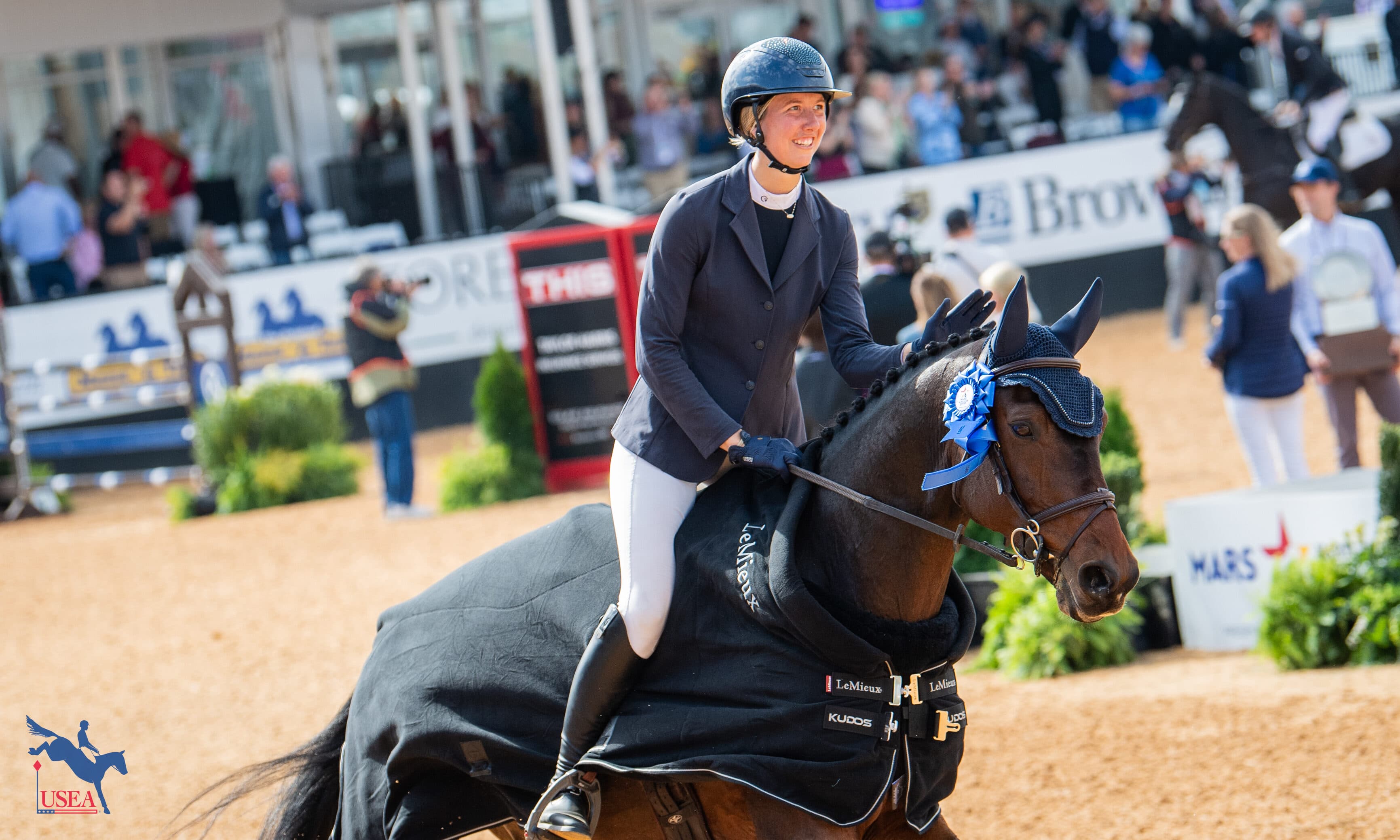 “I couldn't be happier,” she said following their show jumping round where they just had one down, but still held onto the third place position they earned at the conclusion of dressage. “We're a new partnership, so I feel like everything we've done so far is still getting to know each other. Especially today, in the bigger atmosphere, I wasn't really sure how he would be. It was a little bit rattling when we had the first fence down, but then I just tried to keep my cool, and he jumped really great after that. So I couldn't be happier with him.”