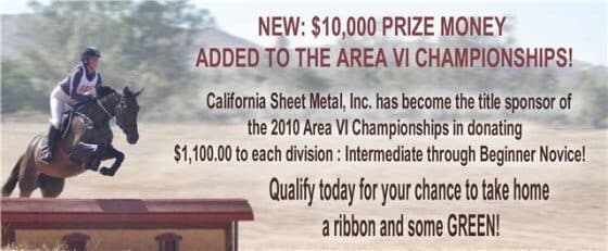 California Sheet Metal has signed on to sponsor the Area VI Championships with a prize money sum of $10,000, which will break down into $1,100 per Championship division. Prize money will be awarded at every level, another goal for James and Taren. “Lower level Eventing has the biggest population of riders, so why shouldnʼt they get the perks that upper level Eventers get?” points out James. “Beginner Novice riders are just as important to our sport.” Along with prize money, the Event will be awarding riders with prizes from Fleeceworks, Inc., Professionals Choice, bridles from Stubben Saddlery, and other prizes from local tack stores.