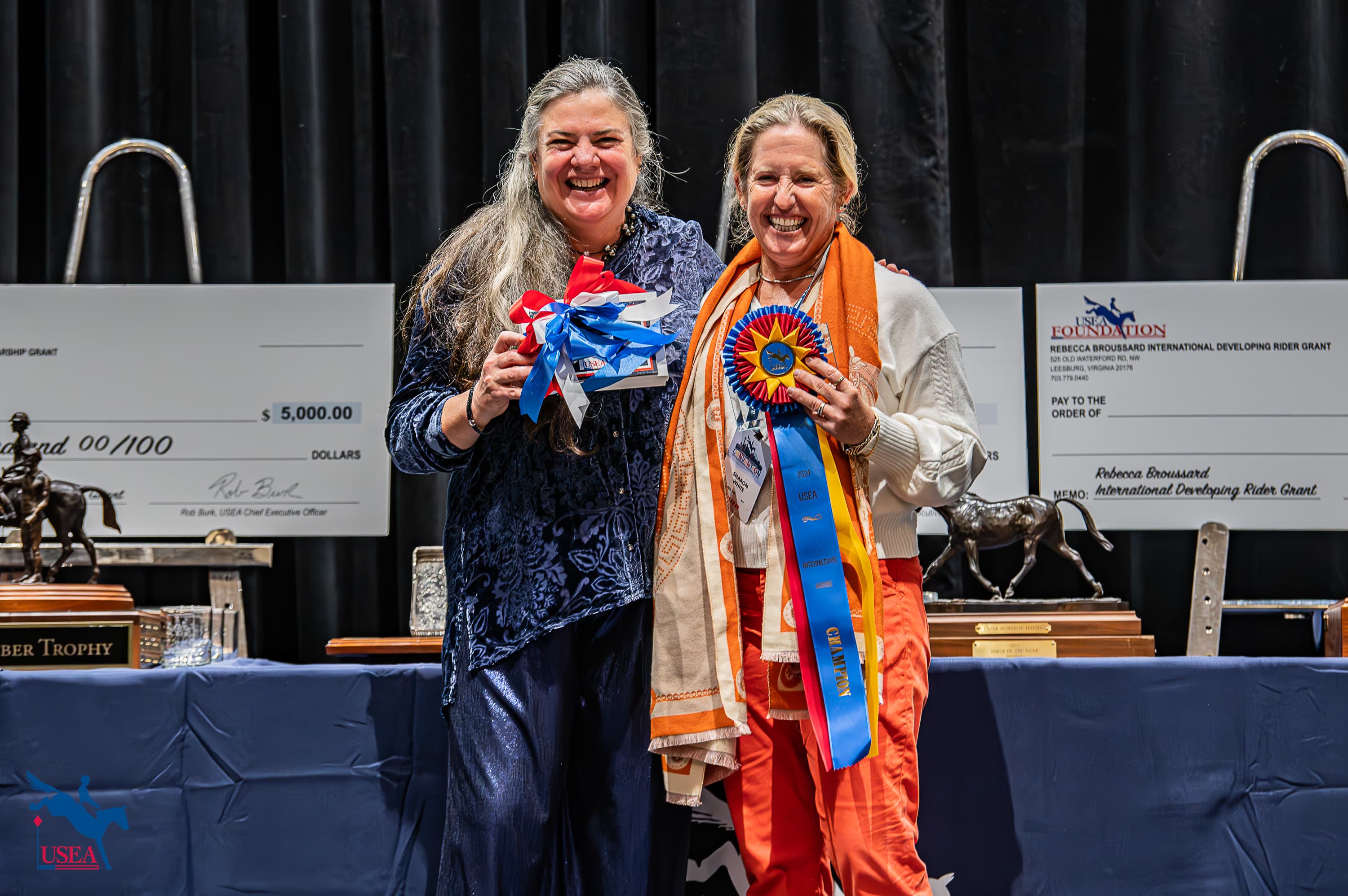 The grant is designed for a horse competing at the CCI2* or CCI3* level who shows potential to one day be on the U.S. team and is presented in memory of Bruce Duchossois. The USET Foundation awarded the 2024 Connaught Grant Sharon White and her own Jaguars Duende.