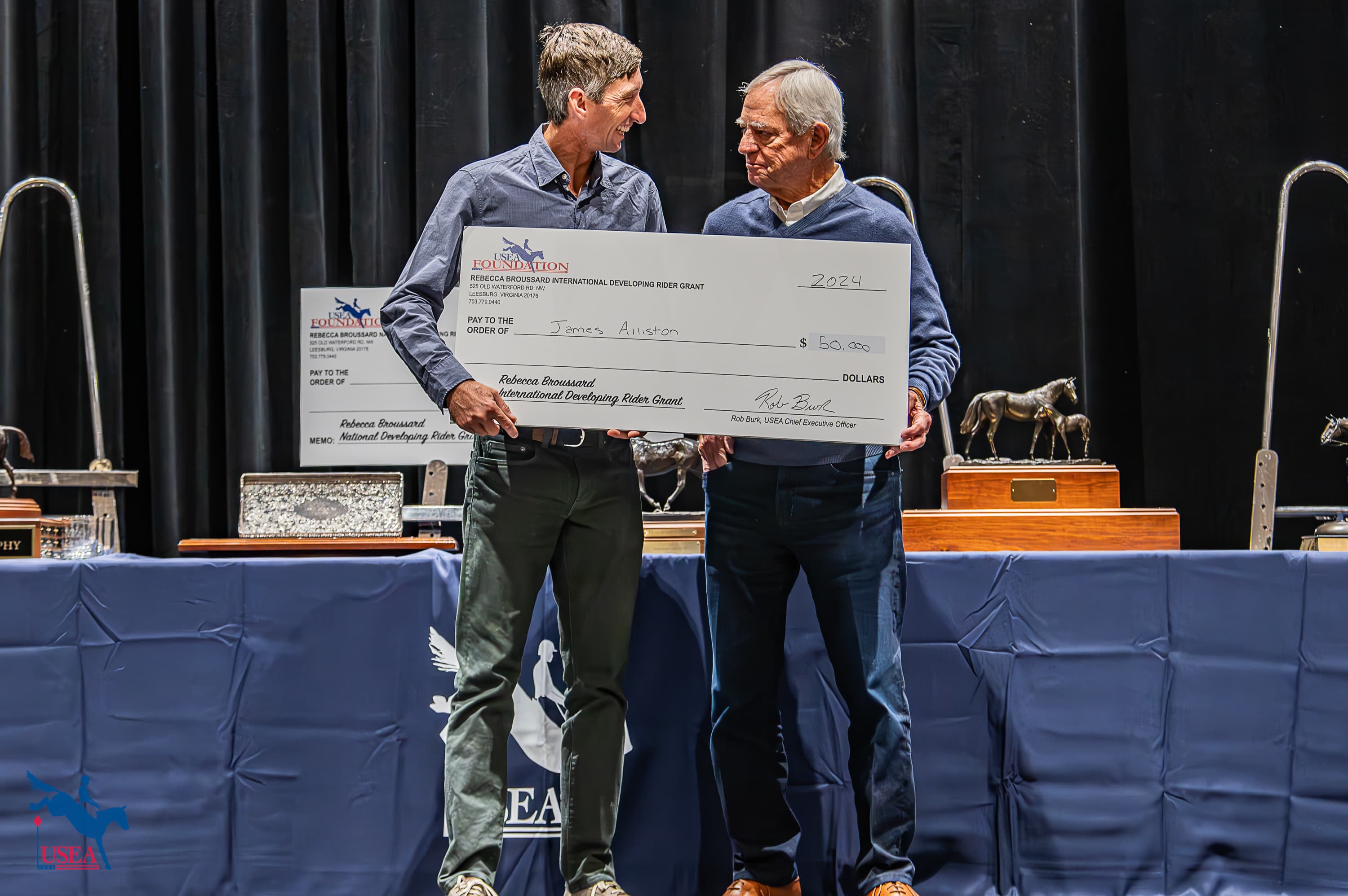 The Rebecca Broussard International Developing Rider Grant awards $50,000 for the educational development of an international quality rider based on competition in eventing on the global stage. The recipient of the grant is based on performance record, interview, and involvement with the eventing community. The 2024 Rebecca Broussard International Developing Rider Grant recipient was James Alliston.