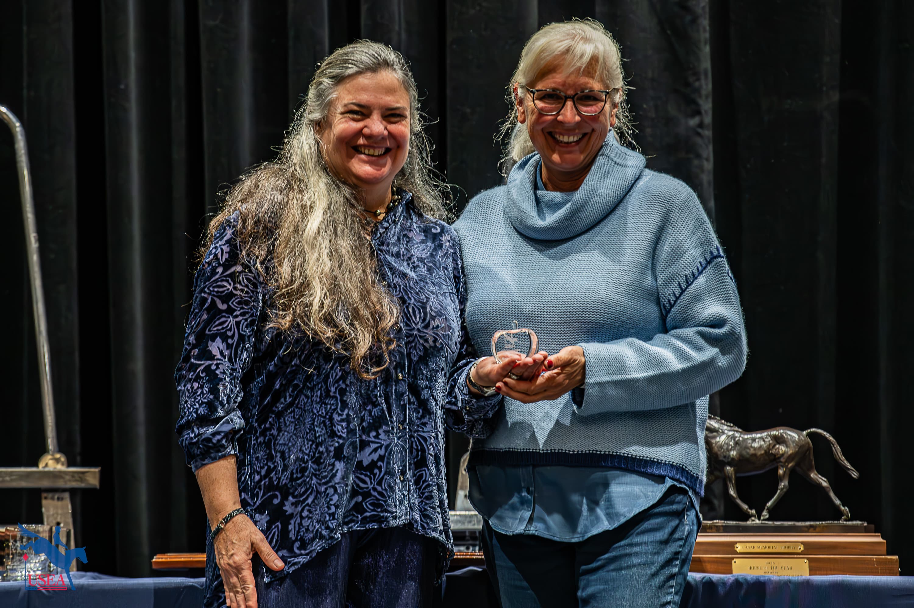 Next, Hannah Diebold from Bates Saddles joined Wolf on stage to present the Bates USEA Mare of the Year award to Nancy Winter’s 10-year-old Connemara Sport Horse No May Moon. Her rider Allison Springer accepted the Frolicsome Trophy, $1,000, and a Bates Saddle.