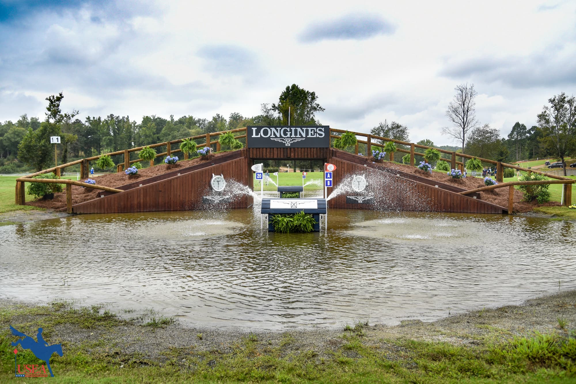 Fences 19 and 20ABC at The Longines Water are the final fences riders will tackle on the golf course before beginning the long pull up the hill heading for home. Riders have their choice of open oxers at fence 19 which will then set them up for the direct route at 20ABC, two round top fountains in the water, or the option route that includes another open oxer at 20A, a brush on the top of the bridge at fence 20B, and another brush down the bridge and to the left at fence 20C.