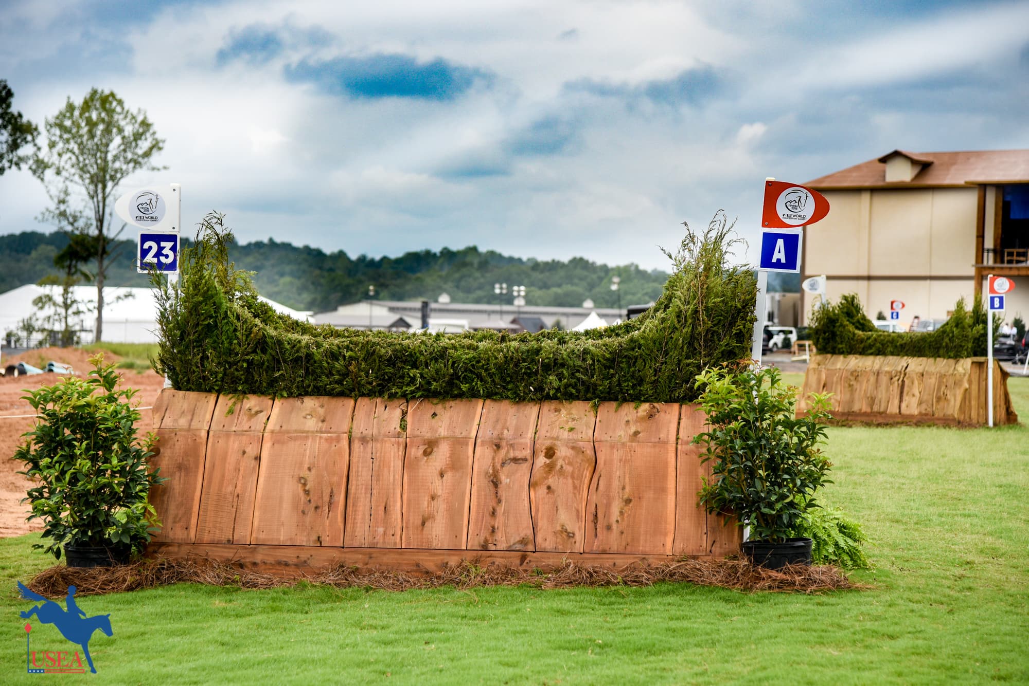 Riders reach the seventh minute marker at the bottom of the hill heading west back towards the main complex at TIEC. There are two fences on the long pull up the hill: fence 21AB, the John Deere Double Brush, and fence 22, the Turtles. Rider pass the eighth minute marker as they reach the top of the hill and come to fence 23ABC, the Polaris Brush. Here riders jump 23A and 23B, brush round tops on an angle, and have their choice of skinny brushes at fence 23C.