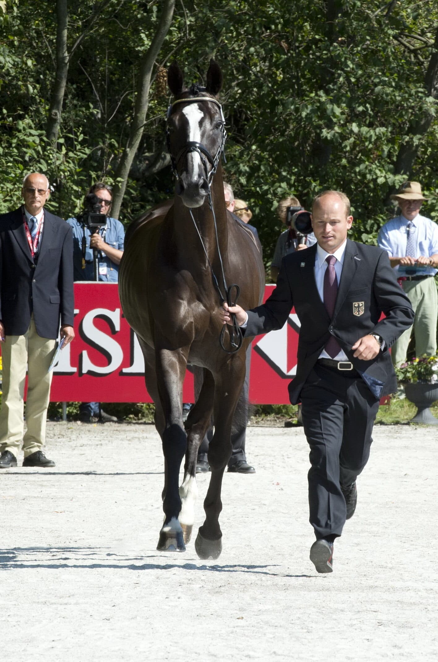The Germans, drawn first to go in the team competition, announced their team order as Dirk Schrade on Hop and Skip, followed by Ingrid Klimke on the nine-year-old FRH Escada JS, Andreas Dibowski (FRH Butts Avedon) and reigning Olympic, World and European Champion Michael Jung as anchorman on Halunke FBW.