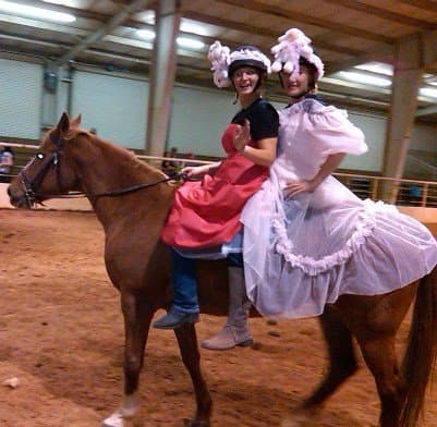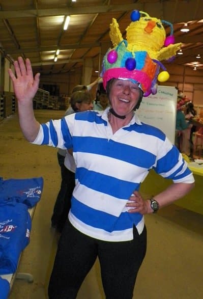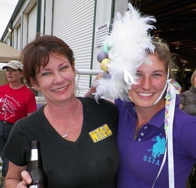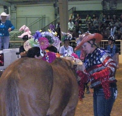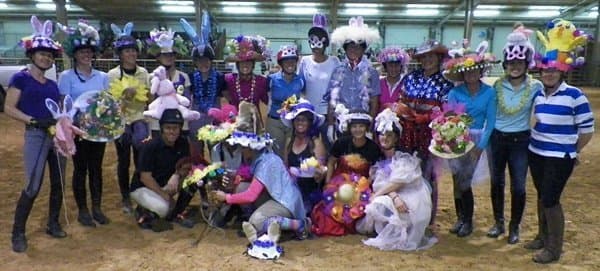 Friday night was a lively fundraising gathering, thanks to the great humor and good sportsmanship of 21 Area V professionals. After the Easter bonnet contest, won by Heather Morris, the pros were provided with ponies for a bareback game, courtesy of Kim Brunson of Brunson Equestrian Center. Riders had to retrieve Easter eggs from buckets fastened to the fence in the indoor arena. The timed event inspired some brinksmanship riding to claim the first-place prize basket of goodies that included pez and Easter candy treats. The ponies, of course, were not fully on board with the plan, and required a high degree of horsemanship to survive some bucking and unruly behavior. However fiery the ponies were, the crowd was even rowdier. Everyone survived and it was an entertaining and successful evening.