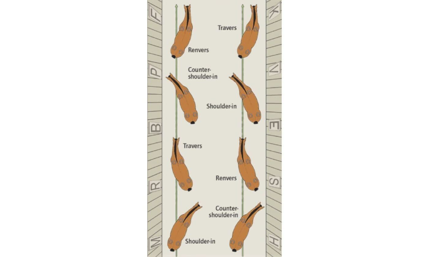 – Shoulder-in and related exercises: shoulder-fore, shoulder-in on three tracks, shoulder-in on four tracks, counter-shoulder-fore, counter-shoulder-in on three tracks, counter-shoulder-in on four tracks.
