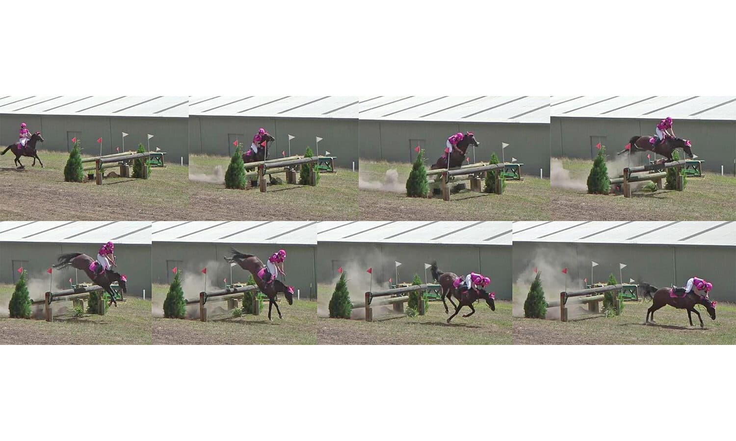 Jumping speed is different than the average on-course speed. All competitors were videotaped at the Kentucky Three-Day Event from a viewpoint perpendicular to the jump for two different questions: a galloping oxer in 2017, and an open vertical into a combination in 2018. Only one forearm contact and no rotational falls occurred.