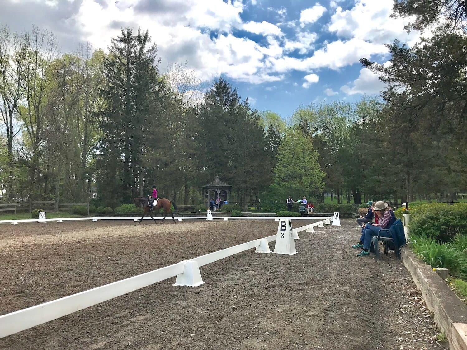 For two days we watched and scored riders at the Novice, Training, and Preliminary levels, testing our scores and observations against Mariyln’s and Cindy’s. You gain a real appreciation for the speed of tests (and for the saintly generosity of scribes) when you try to observe, score, and comment on a test all by yourself. Of course we’re all human, but to accurately score a test one has to maintain a laser level of focus, since, as we know, horses change their minds in an instant. And on a given competition day, that laser focus might have to endure for a solid eight hours with minimal breaks. This level of exactitude was obvious in both Marilyn and Cindy’s abilities to score, comment, observe, teach our session, and shepherd riders into and out of the rings without missing a beat. Meanwhile, I was lucky if I didn’t miss a few movements per test while scribbling down a one-word comment.