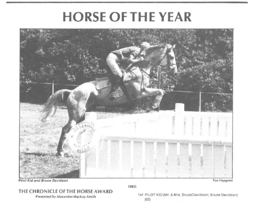 In 1984, Bruce Davidson was awarded the Windy Acre Farm Trophy for Rider of the Year for the second year in a row, following a successful eventing season in 1983 on Pilot Kid, J.J. Babu, and Dr. Peaches.