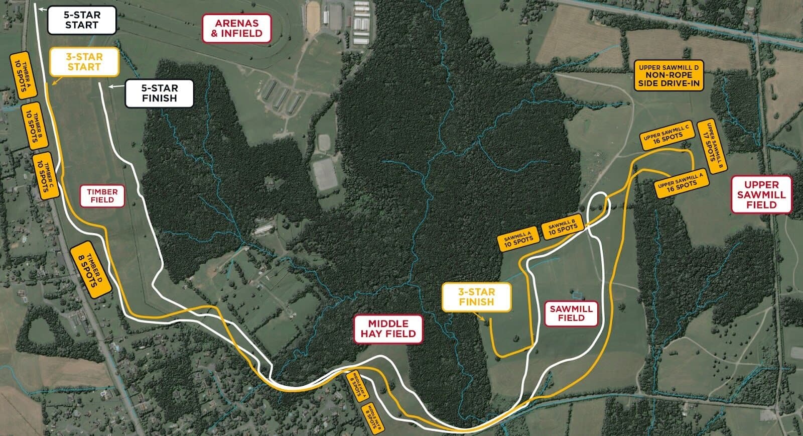 There are a variety of opportunities strategically selected at several locations including 74 “Rope Side” spots along the four-mile five-star cross-country course with incredible views of both the five-star and three-star competitions and another 49 spots along the three-star course with views of the three-star competition only but within short walking distance of the five-star course. There will also be an option for general tailgating spots within easy walking distance of both courses. Shuttle service will be available for convenient access to Retail Vendor Areas, concessions, and other entertainment going on in the infield.