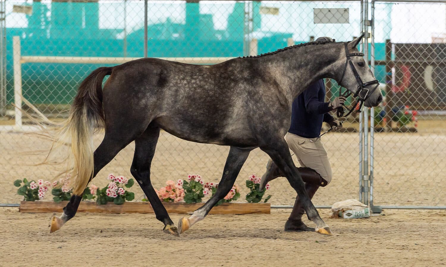 The breeder, owner, and practicing equine veterinarian Kelley Kays DVM shared, “[Flagmount’s Keen Ice] was very well mannered today. He didn’t touch any rails in the jump chute and was enthusiastic about it all. I haven’t gelded him yet because I think he is kind of nice. He’s got a very sweet disposition. I’m an amateur so I didn’t really plan to have a stallion and do any breeding, but he’s been so sweet.”