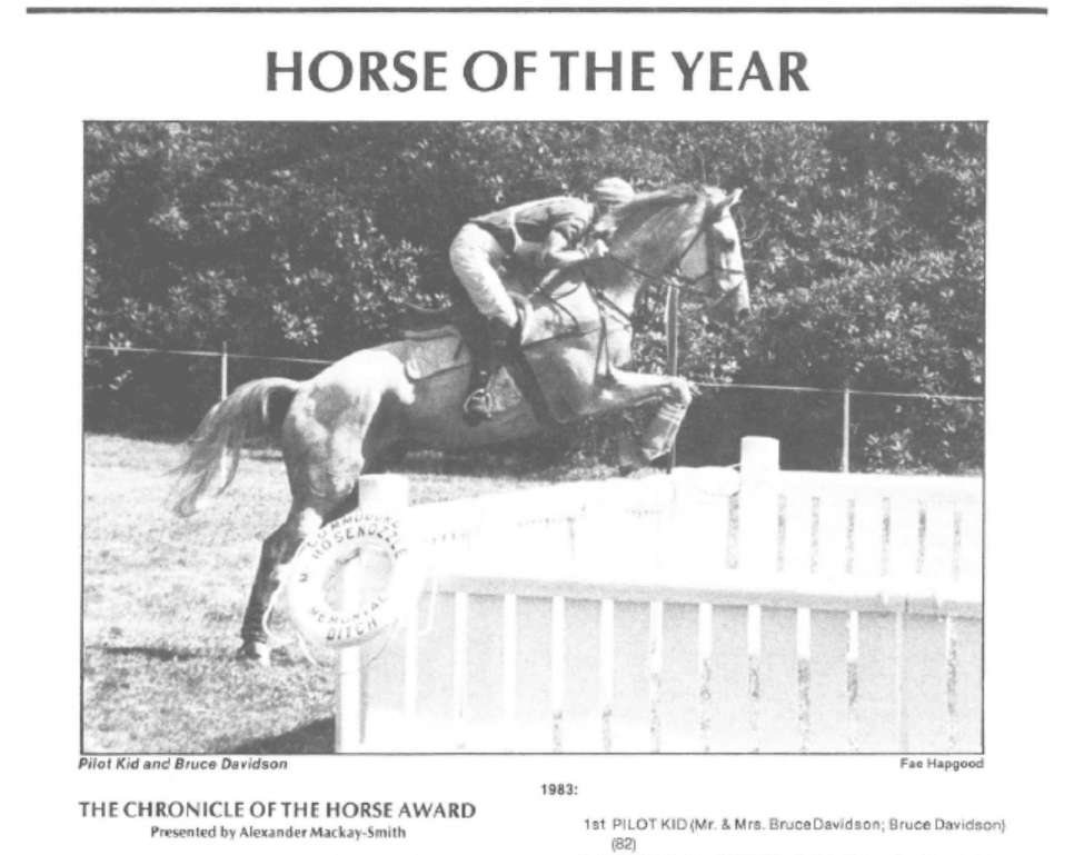 In 1984, Bruce Davidson was awarded the Windy Acre Farm Trophy for Rider of the Year for the second year in a row, following a successful eventing season in 1983 on Pilot Kid, J.J. Babu, and Dr. Peaches. At that point in his career, he had won Burghley and the World Championships twice, and had been riding for the USET for over a decade. The award was made doubly special because a horse that he produced and rode up through the levels, Pilot Kid, was awarded Horse of the Year as well. Read the full article here.