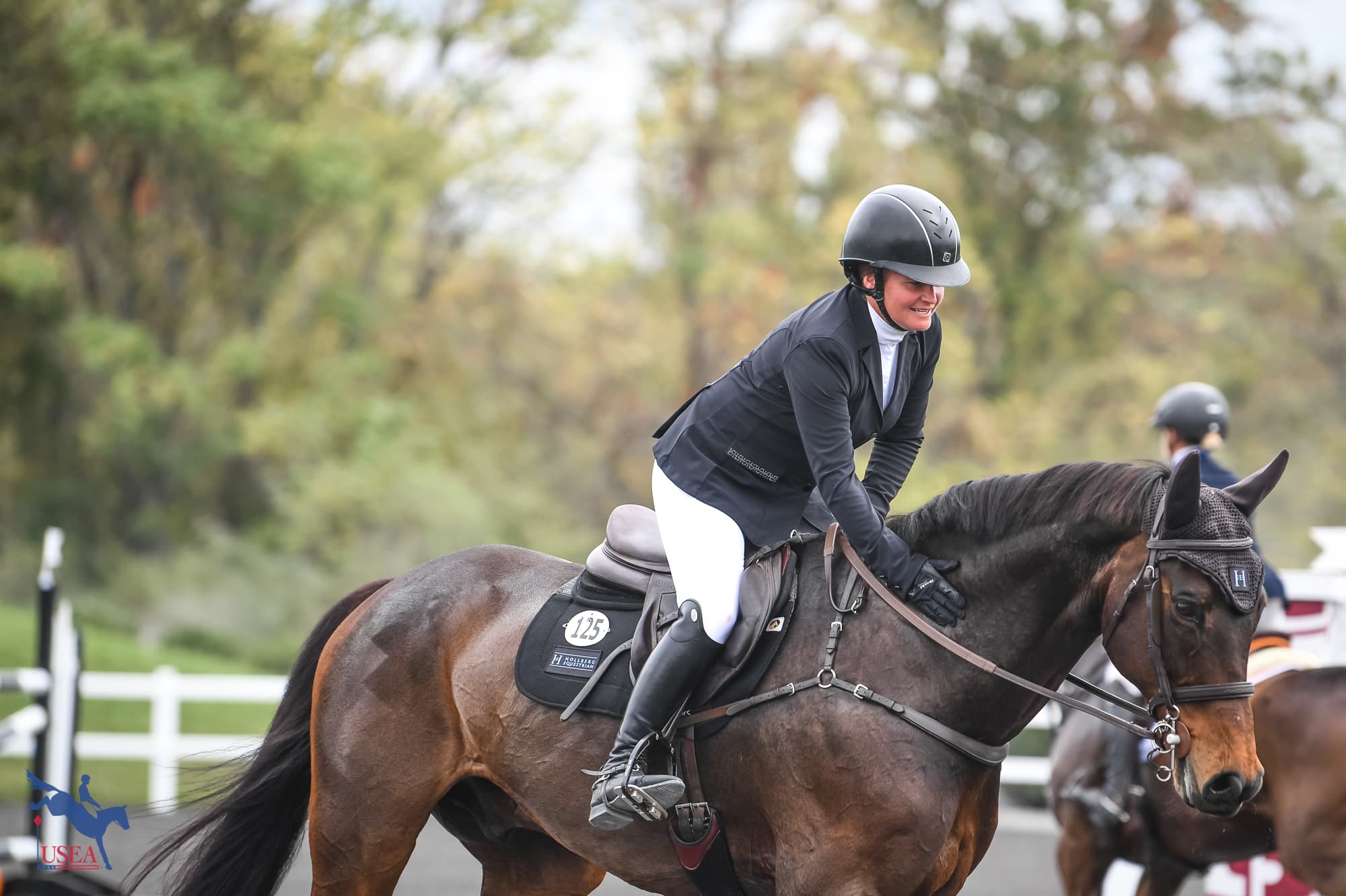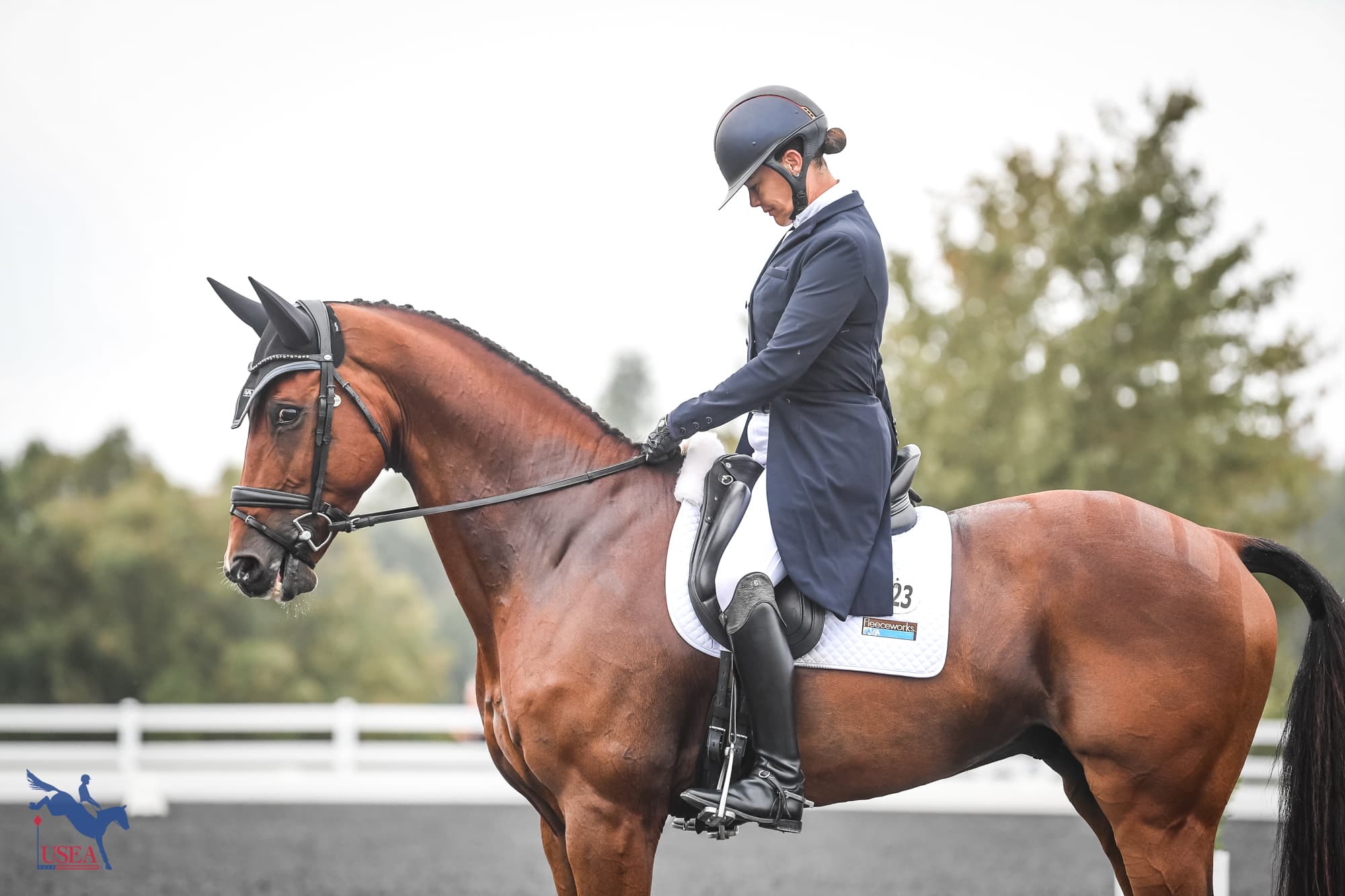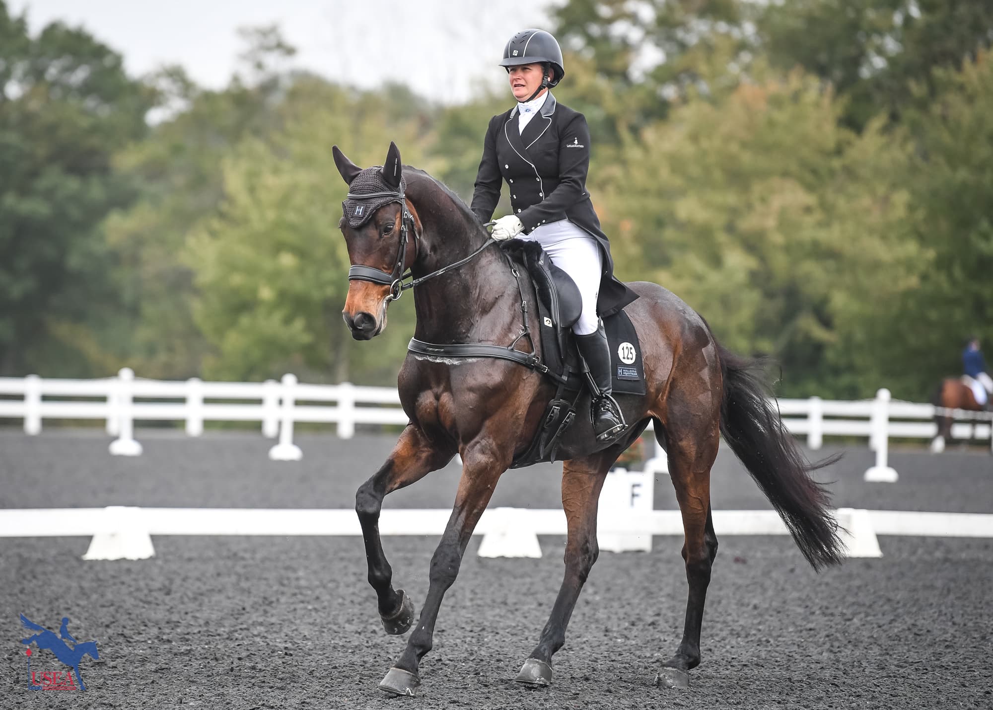 She calls the gelding “Mr. Business” in the ring, although he did have a spook at the banners in dressage on Friday. “He was pretty electric in the dressage arena,” she said.