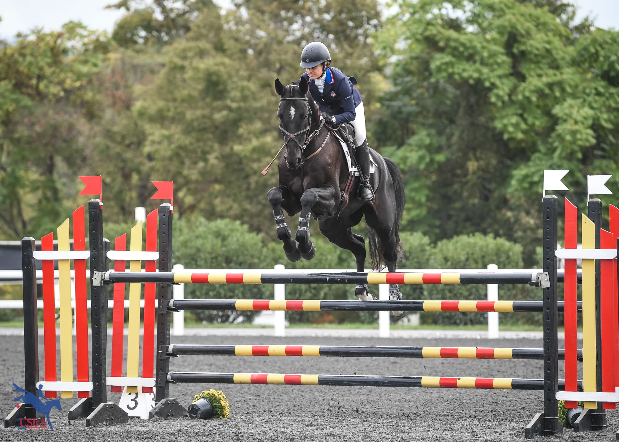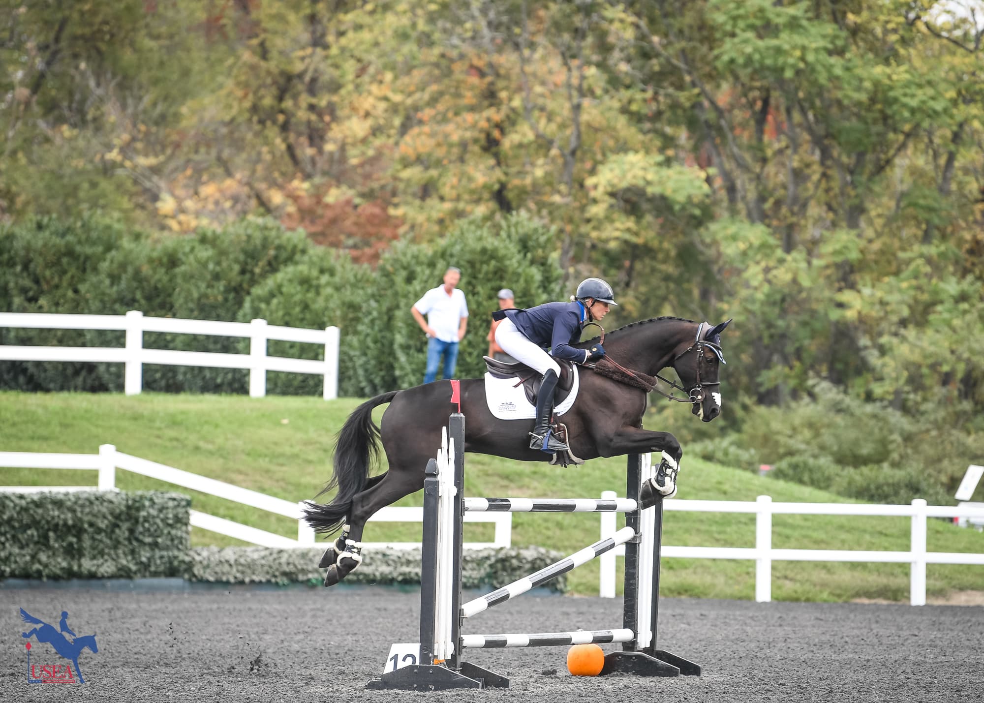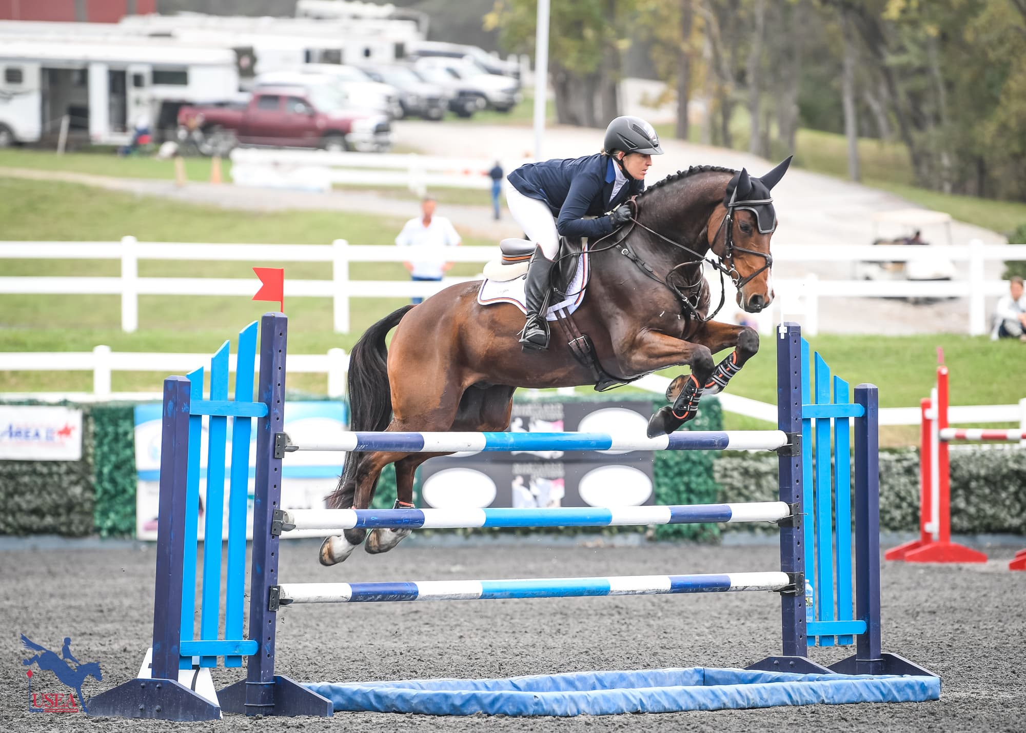 She calls the gelding “Mr. Business” in the ring, although he did have a spook at the banners in dressage on Friday. “He was pretty electric in the dressage arena,” she said.