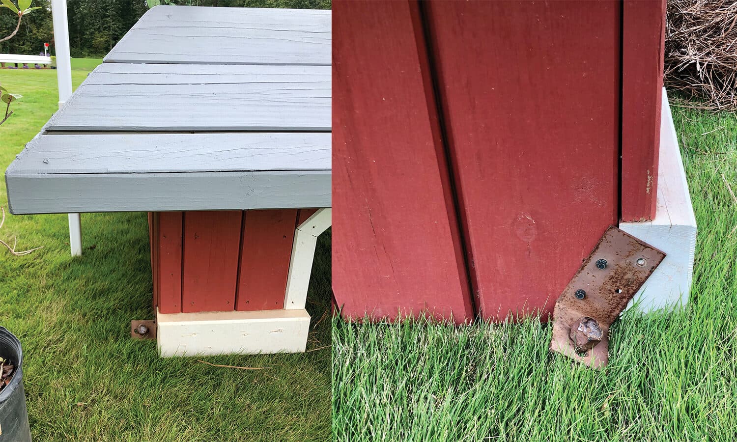With portable cross-country jumps, it is important to notice whether or not they are staked into the ground. Think about what the stake is preventing if something were to go wrong. Stakes are placed on the side of a fence to secure it from tipping or sliding.