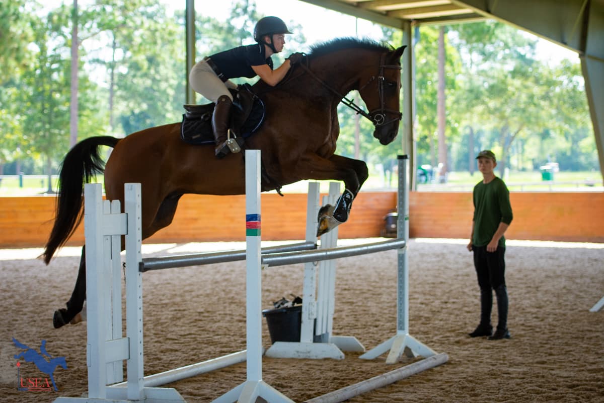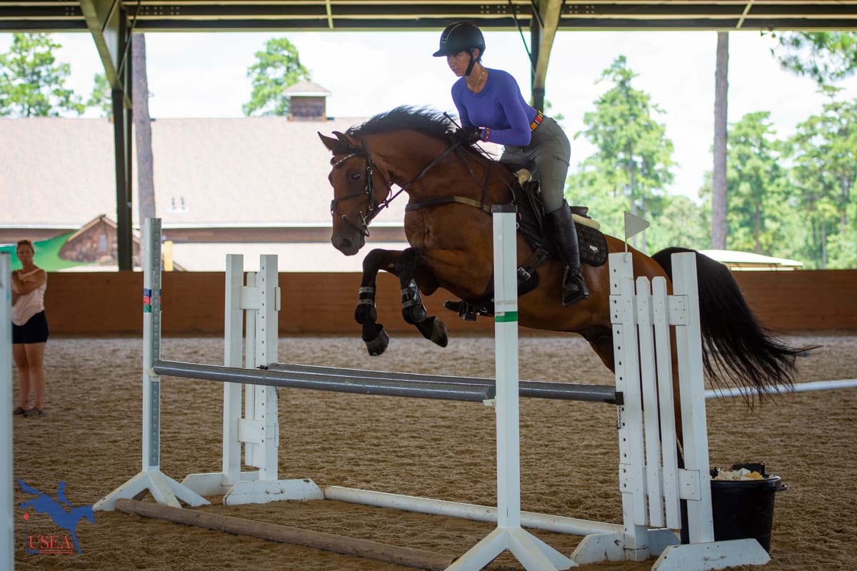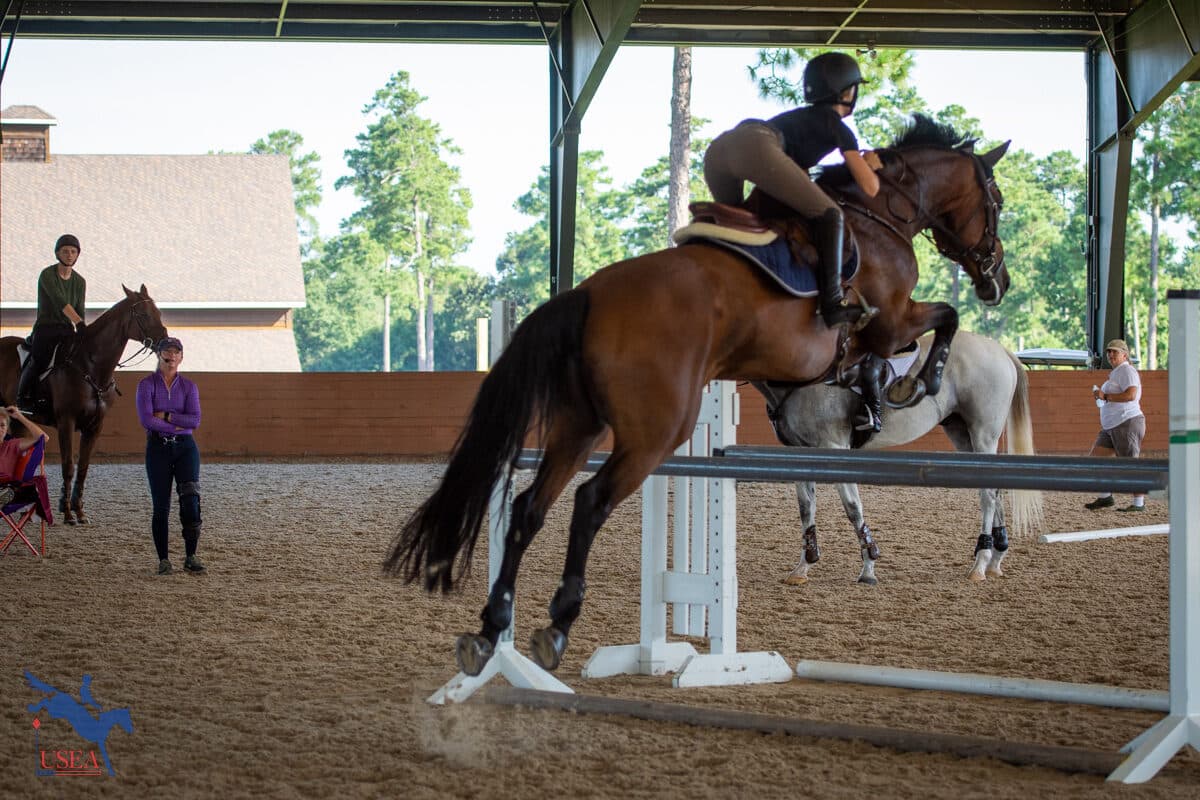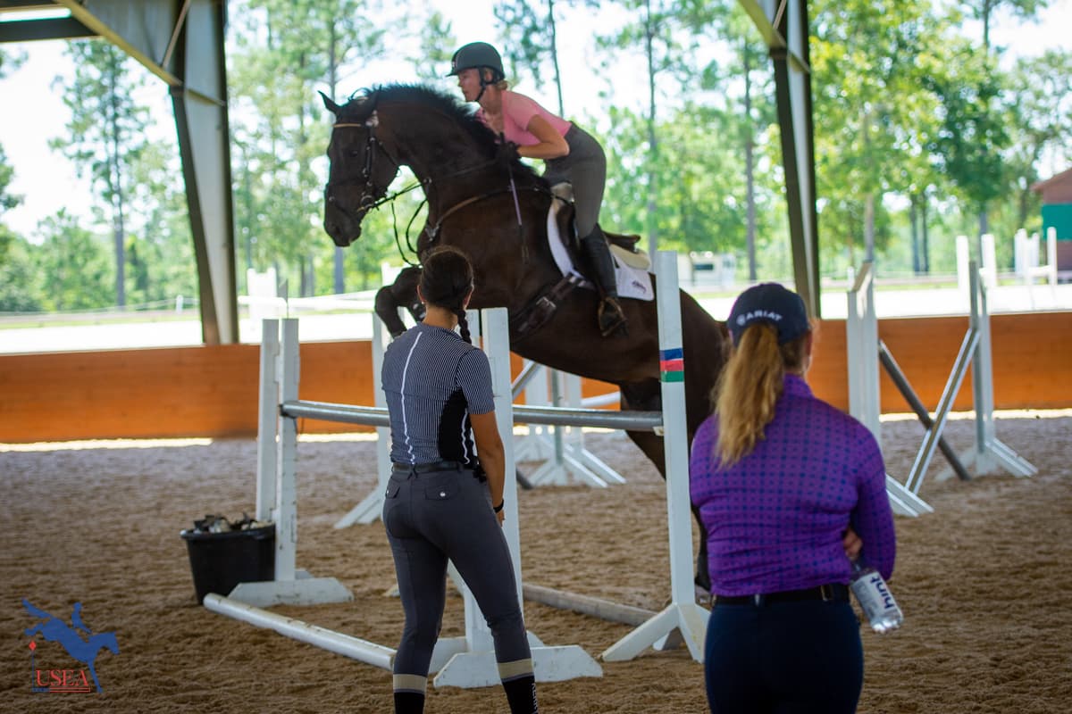 Day two of the USEA Emerging Athlete 21 (EA21) regional clinic at Stable View built on the foundation laid on the flat during Monday’s lessons. Led by USEA Instructors’ Certification Program (ICP) Level 4 instructor Emily Beshear, the jumping lessons shared courses between each three-member group with takeaways tailoring each to each participant’s individual needs.