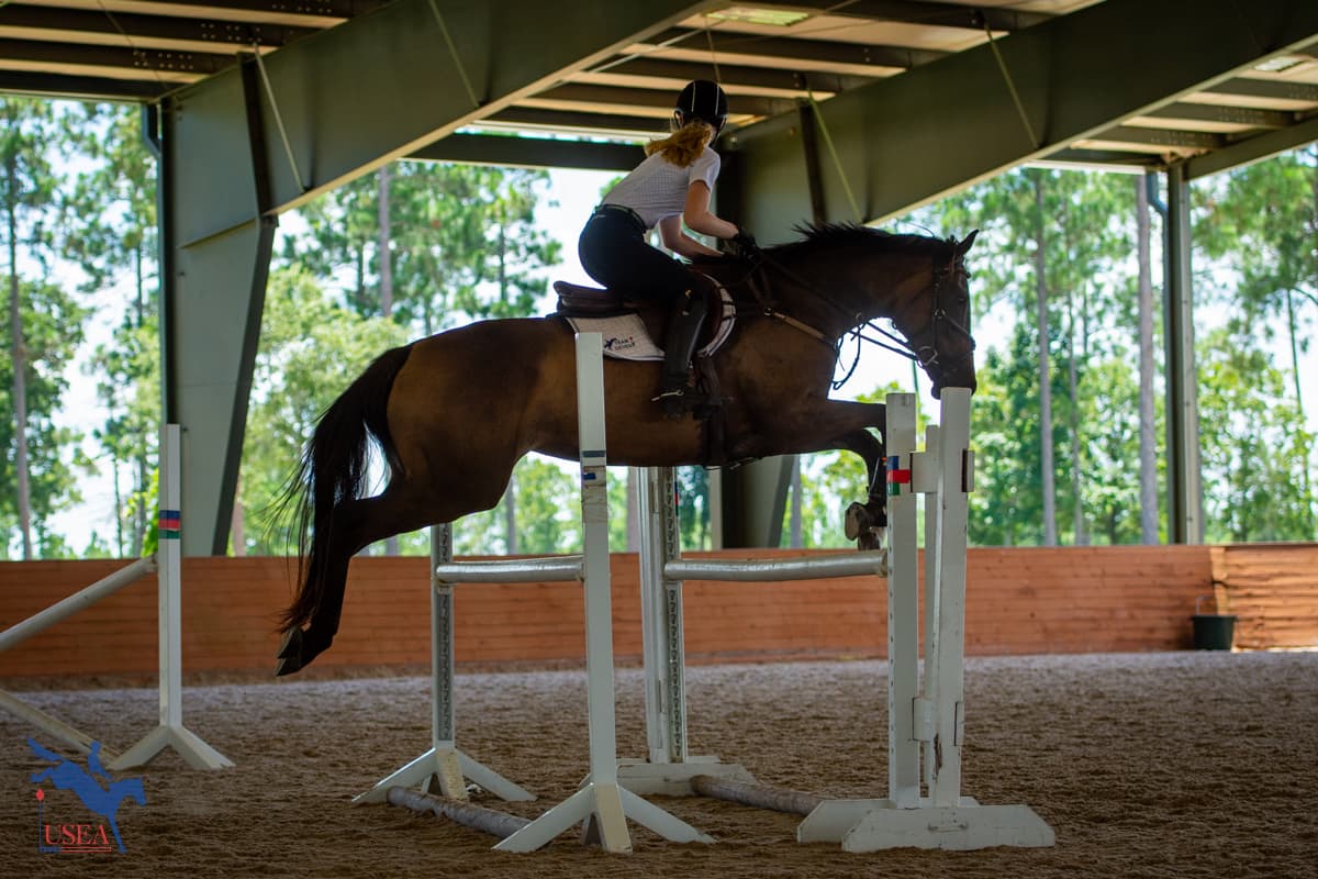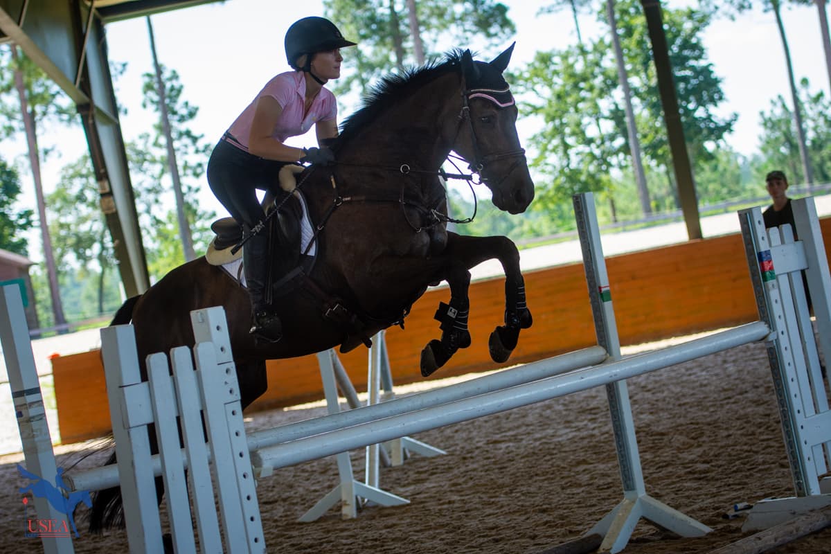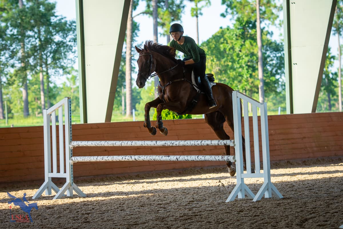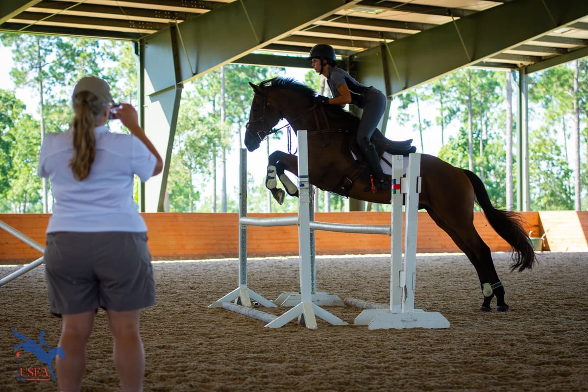 Day two of the USEA Emerging Athlete 21 (EA21) regional clinic at Stable View built on the foundation laid on the flat during Monday’s lessons. Led by USEA Instructors’ Certification Program (ICP) Level 4 instructor Emily Beshear, the jumping lessons shared courses between each three-member group with takeaways tailoring each to each participant’s individual needs.